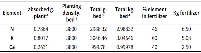 As an example, in Table 2, an exercise with the elements N, K and Ca is proposed; for a 36m2 bed with 3600 plants. The total amount to apply, for example N, is 6.5 kg of fertilizer 46-0-0 (Table 2).