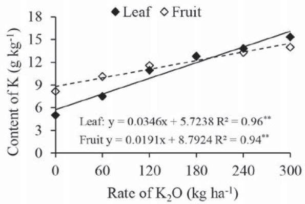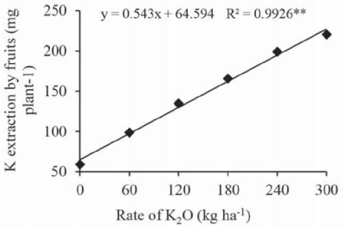 In this study, the greatest extraction value was approximately 220.3 mg K plant-1, found at rate of 300 kg ha-1 of K2O. This difference can be explained by fruit yield, since we obtained a smaller yield in our study; selected cultivar; crop management and interactions between nutrients in soil and plant (Marschner, 2012).