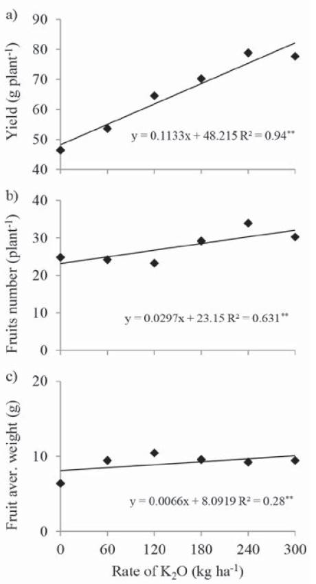 Therefore, average fruit weight was not affect ed linearly by an increasing in K fertilization as observed with yield and fruit number per plant. It demonstrates that in greater K rates, there is a greater production of smaller fruits, not desirable to in nature trade. According to Kaya, Kirnak, Higgs & Saltali (2002), K rates much greater than the recommended, promote reduction in fruit size and yield of strawberry.