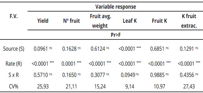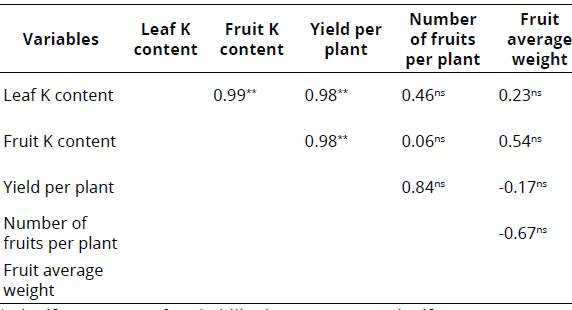We also observed a positively correlation between K content in leaves and fruit yield (r = 0.98); and K fruit concentration and yield (r=0.98) (Table 3). K is related to plant photosynthesis because it promotes protein synthesis and activates the necessary enzymes for its operation, regulates the opening and closing of stomata, participates in starch synthesis and participates in the trans location and storage of photo-assimilated (Kaya, Kirnak, Higgs & Saltali, 2002).