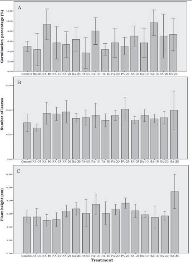 Each treatment is labeled by two capital letters: NA (nitric acid), PA (phosphoric acid) and SA (sulfuric acid), followed by a number indicating the number of minutes that seeds were soaked. Three variables are shown: (A) germination percentage, (B) number of leaves and (C) plant height. No significant differences were found using ANOVA at 5% of significance level. Bars represent standard deviation.
