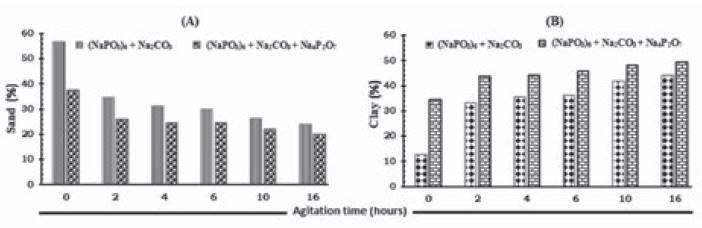 In addition, after stirring process, clay contents at 10 and 16 hours were quite similar for both dispersants, 41.87 and 44.13% for Calgon and 48.05 and 49.38% for proposed mixture, respectively; this corresponds to an increasing in 2.26 and 1.33% after 6 h. When sand and clay contents are compared with an increasing in stirring times, it was observed that the greatest difference between the percentages of these fractions occurs after 2 hours (Figure 1b).