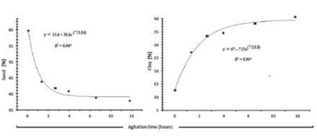 Note that, mathematical models suggest that an equilibrium state is achieved as stirring time. Thus, mathematical equations constituted by two additive terms are congruent with physical interpretation that soil aggregates are destroyed until a limit values associated with sand fractions.