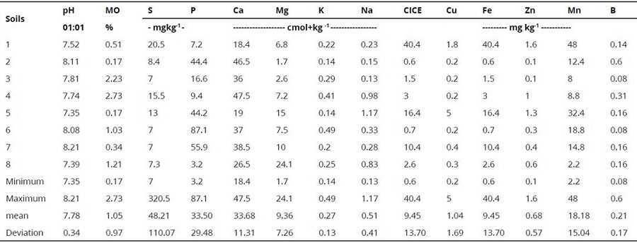 Average pH values for soil samples was 7.0, and in consequence, these soils can be classified as slightly alkaline. In addition, soils showed contents of soil organic matter lower than 2%. Average values of Ca2+, Mg2+, K+ and Na+ were 33.7, 9.4, 0.3 and 0.5 cmolkg-1, respectively. Low contents of Cu2+, Fe2+, Mn2+ and Zn2+ were found.