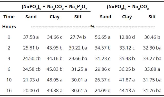 By application of Tukey test, is evidenced a significant difference of 5% among stirring times during sand, clay and silt fractions quantification with the use of dispersant solutions. However, no significant difference between 10 and 16 h of stirring was not evidenced. The above mentioned, indicates the contents of soil textural fractions are the same for these times (Table 2).