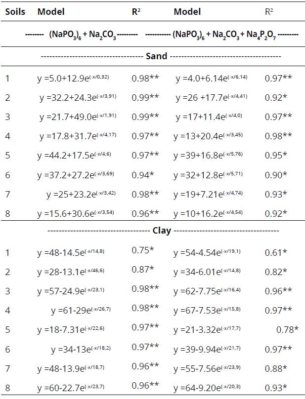 On the other hand, for clay fraction, the best model obtained was described by a first-order exponential increase (P <0.05 and 0.01). When Calgon was used as dispersant, determination coefficients between 0.93 and 0.98 (P <0.05 and 0.01) were determined for most soils. Only model for soil 1 did not present a good fit, with quadratic correlation coefficient of 0.75 and 0.61 for two dispersant solutions.