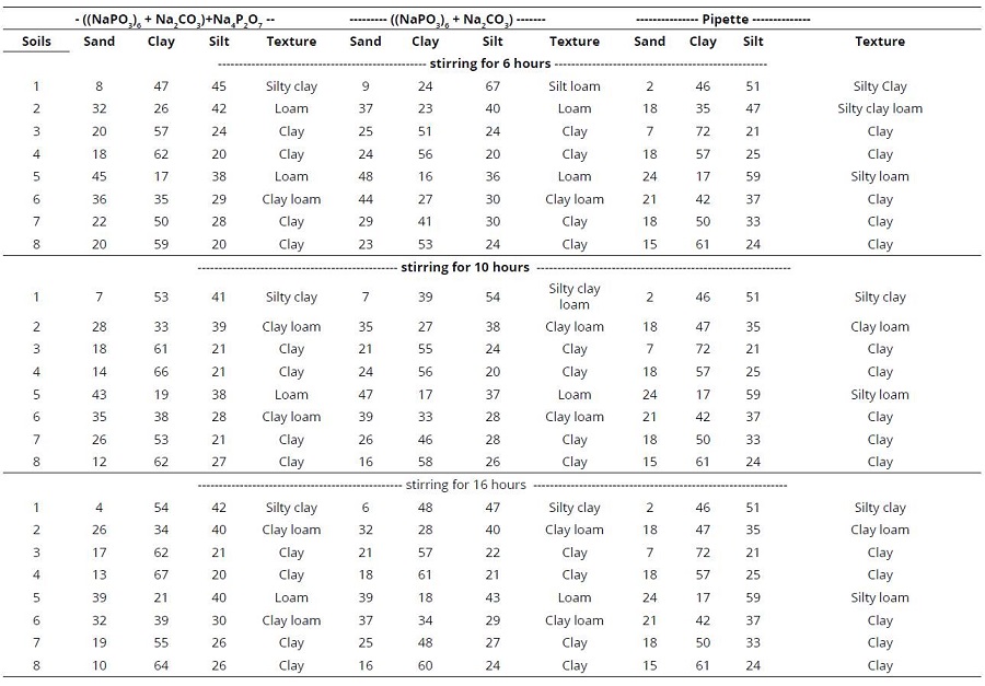 In Table 4, can be seen that when clay, sand and silt contents measured in function of sti rring time are used for determination of textural classification by Bouyoucos. For a stirring time of10 h, dispersant based on (NaPO3)6 + Na2CO3 + Na4P2O7 was similar in 75% to that determined by Pipette method whereas when (NaPO3)6 + Na2CO3 was used as dispersant, similarity obtained was only 62.5%.
