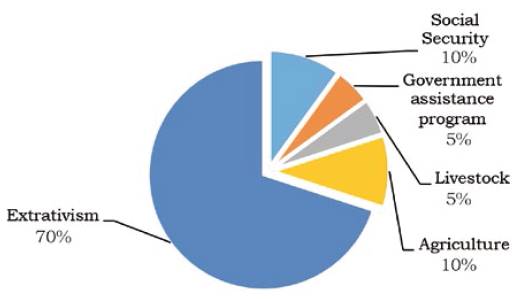 Extractivism takes about 70 % to 80 % of the family income (Figure 5), having as complementary income government assistance programs such as Bolsa Família, social security, livestock, which was mentioned to a lesser extent, and agriculture, recalled by every family interviewed.