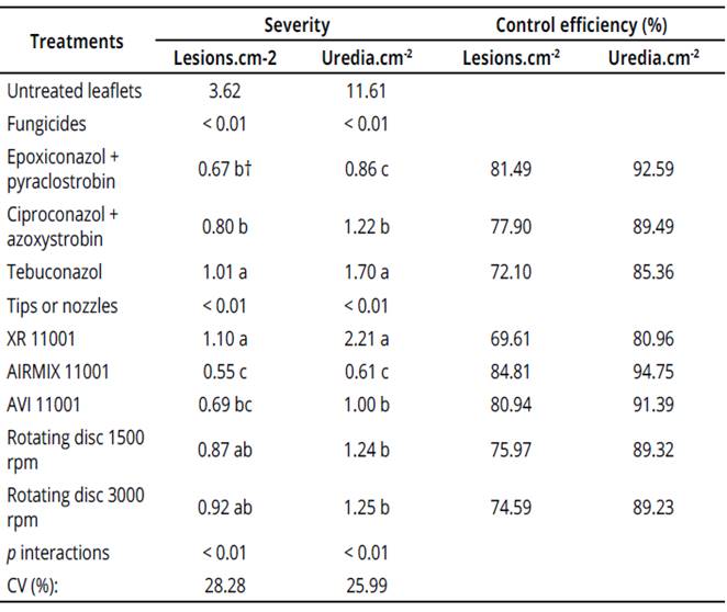 The maximum severity observed in untreated leaflets was 3.62 lesions.cm2 and 11.61 uredia. cm2 (Table 1). Moreover, number of lesions and uredia.cm2 in treated leaflets were four and ninefold higher, respectively, when compared to non-treated leaflets. In general, a lower number of lesions and uredia.cm2 were observed in leaflets treated with the two mixtures, with an average control efficiency of 85 %. Furthermore, lower number of lesions and uredia.cm2 (Table 1) were recorded in leaflets sprayed with the AIRMIX 11001 tip (Table 2).
