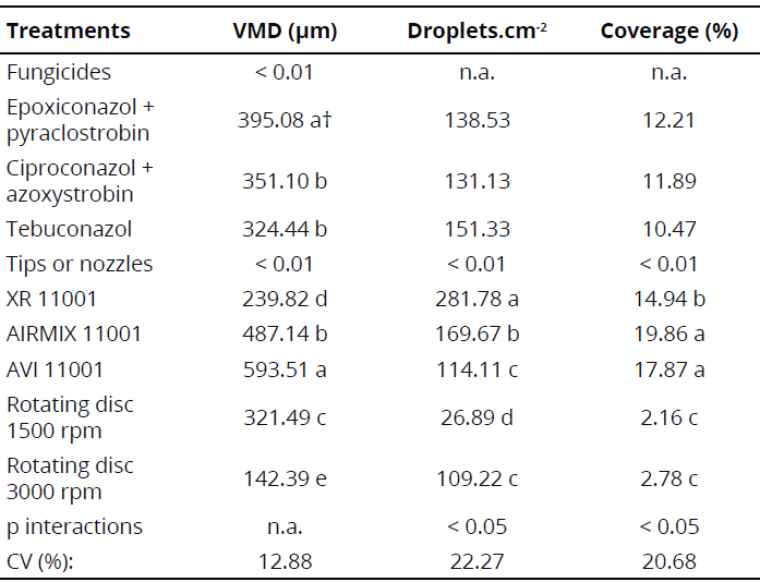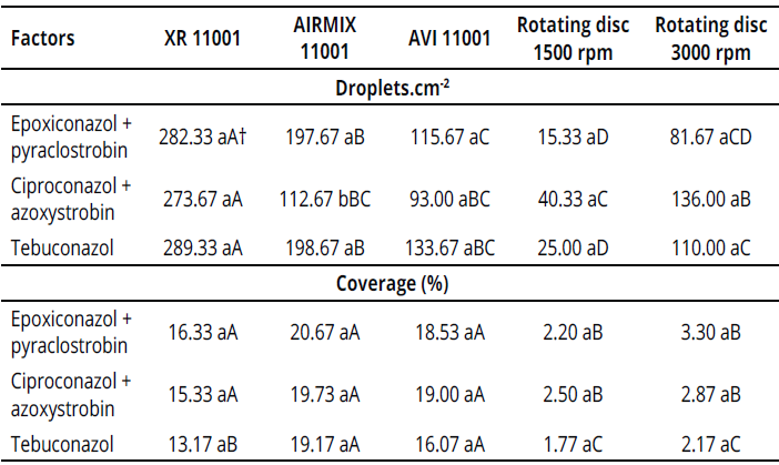 Furthermore, in the significant interactions analysis corresponding to spray parameters (Table 4), number of droplets.cm2 was higher with the epoxiconazol + pyraclostrobin and tebuconazole fungicides using the AIRMIX 11001 tip. In addition, a higher number of droplets.cm2 was observed with the use of a XR 11001 tip and all fungicides. Regarding coverage, the use of all tips and fungicides generated higher coverage, except with the XR 11001 tip and tebuconazol fungicide.
