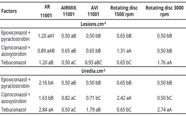In general, the analysis of significant interactions showed a similar behavior of number of lesions and uredia.cm2 among the fungicides inside each tip or nozzle (Table 3). However, some exceptions were found. In the first case, number of uredia.cm2 was lower using the XR 11001 tip and mixtures of fungicides. In the second case, the number of lesions.cm2 was lower using tebuconazol with AIRMIX 11001 and AVI 11001 tips, as well as with the portable spray nozzle at 1500 rpm.