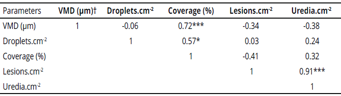 Asian soybean rust severity was not correlated with any of the spray parameters (Table 4). In contrast, the number of lesions and uredia.cm-2 (r = .91) were correlated positively. Furthermore, coverage was also positively correlated with VMD (r = .72) and number of droplets.cm2 (r = .57) (Table 5).