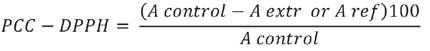Capture capacity of the radical DPPH. The anti-oxidant capacity was determined by the method described by Brand-Williams, Cuvelier and Berset (1995). A methanolic solution of the 0.1 mM 1,1-diphenyl-2-picrylhydraz (DPPH) radical was prepared. Each of the eight LE were used to prepare five aqueous solutions in increasing concentrations. The reaction tubes contained 0.40 mL of the LE in aqueous solution with 0.800 mL of the methanolic DPPH solution and were stirred for 30 seconds. After 30 minutes in the dark at room temperature, the absorbance was recorded at 517 nm (A extr spectrophotometer). In parallel, a control tube was prepared; another blank sample was used to correct the absorbances of the extracts, the tests were run in triplicate. Simultaneously, a calibration curve was made using 6 -hy dr oxy- 2,5,7,8- tetr amethylchr oman- 2 - carboxylic acid (Trolox) (Aref), its concentrations were in the range of 1.8 - 5.4 ^g/mL. The results were expressed as IC50, these values were obtained by designing the linear equation in the graph, for the percentage of the capture capacity of the DPPH radical (PCC-DPPH) versus the extract concentration of each sample (^g/mL extract). The same procedure was used for the trolox (y = 18.275x - 6.4 y R2 = 0.9906). El PCC-DPPH was obtained by the following relationship:
