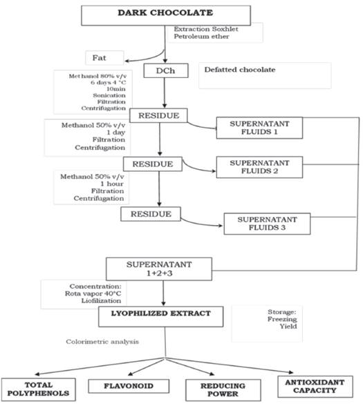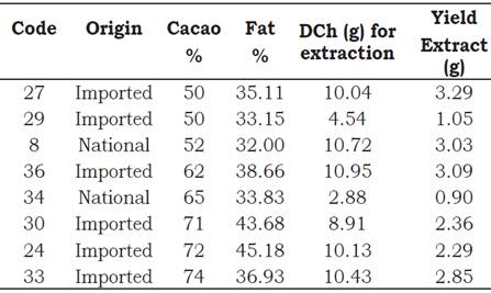 Sample treatment. The chocolate samples were dried using the 931.04 method (Horwitz and Latimer, 2016) and then they were defatted with petroleum ether using the Soxhlet 963.15 method (Horwitz and Latimer, 2016). The fat was removed and defatted chocolate (DCh) were obtained (Hu et al., 2016). The solvent excess was removed at room temperature. DCh showed light brown color, they were packaged in polyethylene bags and stored in refrigeration until the extraction process was conducted.