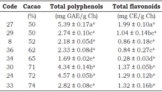Total polyphenol content (TPC). The TPC varied from 1.69 ± 0.02 to 5.39 ± 0.17 mg GAE/g Ch for chocolate containing 50%, 52%, 62%, 65%, 71%, 72% and 74% of cacao (Table 2), in this regard, Todorovic et al. (2015) found between 7.21 ± 0.49 and 12.65 ± 0.45 mg GAE/g in five chocolate samples whose cacao content was between 65% and 75%. These results were obtained in a study by Grassi et al. (2005), where 5 mg of polyphenols correspond to 1 g of chocolate, whereas Vinson et al. (2006) found that 23.9 mg of polyphenols correspond to 1 g of chocolate. In both studies the polyphenol standard used is not mentioned. However, in our study the gallic-acid standard was used.