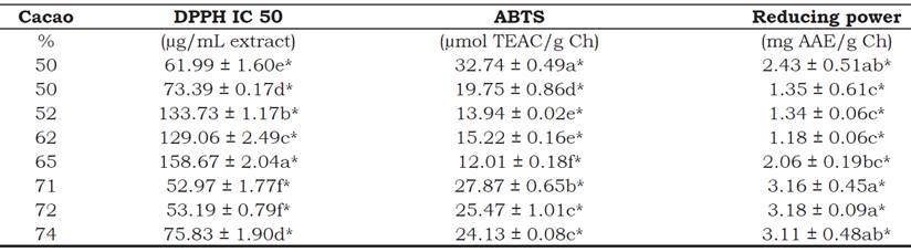 Chocolates with 72%, 71% and 74% cacao contain 3.18 ± 0.09, 3.16 ± 0.45 and 3.11 ± 0.48 mg AAE/g Ch, respectively, and these show greater reducing power. In contrast, chocolates with 62%, 52% and 50% cacao (code 29) (one of them domestic product) contain 1.18 ± 0.06, 1.34 ± 0.06 and 1.35 ± 0.61 mg AAE/g Ch, and these exhibit a lower reducing power (Table 3). Padilla et al. (2008), studied the seeds of Theobroma cacao with a TPC of 6.66 ± 0.04 g GAE/100g and an RP of 5,80 ± 0.08 g AAE/100g, and found that the TPC level influences the RP value. A similar effect was found in this study, with the samples containing 71% and 72% cacao, for which there was a slight increase in RP for each increase of TPC. This may be due to the existence of different chemical structures in the TPC that react as electron donors, which will influence the RP (Padilla et al., 2008). The results showed that the methanol extracts of DCh are capable of donating electrons that can react with free radicals. The difference in the RP test is explained by Todorovic et al. (2015) who demonstrate that the quality of the raw material (liquor or cacao paste) and the production processes of chocolate can have a significant impact on the quality of the final product.