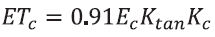 Estos recipientes se ubicaron sobre una plataforma de 10 cm de altura y fueron protegidos con malla para evitar el ingreso de animales. Las mediciones bajo la concepción de la metodología del tanque clase A se realizaron considerando que en los recipientes plásticos se produce una evaporación 9% mayor que en el tanque antes mencionado (Torres y Cruz, 1995), cuyas dimensiones estándar son 120.7 cm de diámetro y 25 cm de altura (Allen, et al., 2006). Por tanto, la evapotranspiración del cultivo (ETc ), conteniendo axiomáticamente a la evapotranspiración de referencia (ETo ), según el método del tanque evaporímetro, fue establecida por la ecuación 2, en donde Ktan es un coeficiente tabular del tanque que depende de la velocidad del viento, de la humedad relativa, del tipo de cubierta alrededor del tanque y de la distancia del cultivo a barlovento (Allen, et al., 2006).