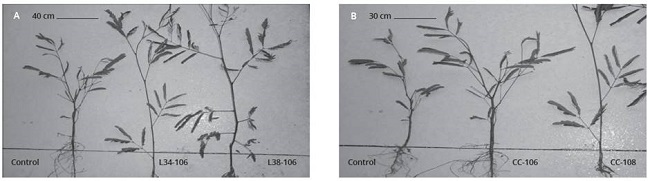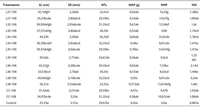 For the dry weight of the aerial part (WAP) the behavior of the different treatments was homogeneous, only significant differ ences (P < 0.05) were found in L35-106 (0.763 g) and L38- 106 (0.930 g); in relation to the control (0.420 g) (Table 3). Regarding CC-106 (0.467 g) and CC-108 (0.580 g), there were also statistically significant differences, except for L35-106, which only showed significant differences with CC-106.