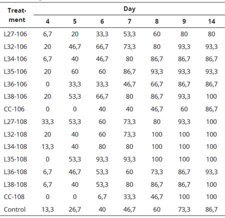 Meanwhile, all the treatments inoculated with the concentrations of 108 cells.mL-1 (CC- 108, L27-108, L32-108, L34-108, L35-108 and L38-108) presented a 100% in the accumulated germination, except of L36-108 (93.3%), compared to control (86.7%) (Table 1). All the treatments showed superiority except for the commercial strain (CC-106), L34-106 and L36-106, which showed similar results to control, and L27-106 (80%) showed accumulated germination lower than the control.