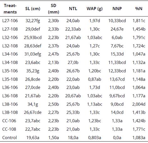 The nitrogen percentage (%N) it was found that L34-106 (1,783), L36-106 (2,143) and L38-106 (3,240) presented highly significant differences with respect to L27-108 (1,003), CC -106 (1,027), CC-108 (1,08) and control (0,887), with better results in the concentration 106 cells.mL-1. With the above results, it is infer that the variables SL, SD, NTL and WAP, were influenced by the concentration factor, being the concentration 106 cells.mL-1 the most successful. This can be the effect of the competition for nutrients and the root among the same bacterial population, thus slowing down the establishment process between the roots and the rhizobia, thus being able to be noticed in the development of the seedlings.