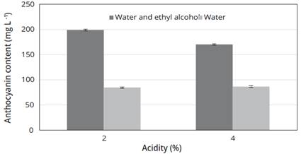 Using the parameters that showed the highest extraction of anthocyanins, it can be established that for two extraction solutions with their two variants, the highest CAT was obtained with the solution of water plus ethyl alcohol in its 2% acidification variants giving a CAT of 199.00 ± 2.00 mg/L and 170.30 ± 1.20 mg/L for the acidification of 4% (Figure 2).