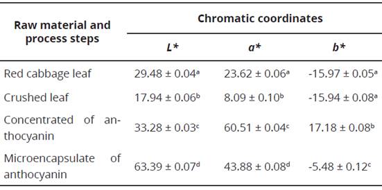 In Table 1 chromatic coordinates obtained for each stage of the anthocyanin extraction process are presented; establishing that the microencapsulation was the one with the highest luminosity value ( L* = 63.39 ± 0.07); while, the concentrate showed a strong tendency towards red (a* = 60.51 ± 0.04), additionally it was the only stage in the process that presented a positive value for the chromatic coordinate b* (17.18 ± 0.08). For the coordinates L* and a* all the stages had statistically significant differences (P < 0.05) between them; however, regarding the chromatic coordinate b*, there were no significant differences between complete and crushed leaves of purple cabbage, despite there being significant differences in the coordinates for the other two stages (concentrated and microencapsulated).