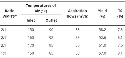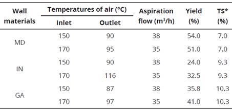 The best yields with respect to the initial solids content were obtained with the WM maltodextrin with 54 and 51% at dryer inlet temperatures of 150 and 170 °C, respectively. On the other hand, the lowest yields were 24.0 and 32.5% for input temperatures of 150 and 170 °C, respectively, both granted by the WM inulin (Table 2).