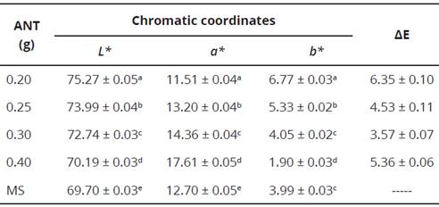 The microencapsulation of anthocyanin with the WM maltodextrin that presented a yield of 58.9% was added to the fermented milk matrix with a color similar to white, with various concentrations of microencapsulation ranging from 0.20 to 0.40 g in 25 mL of milk beverage. Table 4 shows the chromatic coordinates for each addition of microencapsulation to the fermented milk beverage and the color differences (AE) that were presented with respect to the commercial pattern; observing that the formulation that has 0.30 g of microencapsulation in 25 mL of fermented milk matrix was the one that presented the least variation of color (AE) with the commercial pattern, with a value of 3.57.