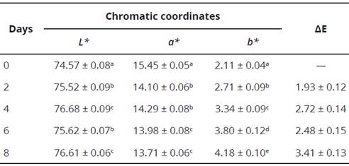 Table 5 shows the color measurements using the CIEL*a*b* system with their respective standard deviations. As for color variations presented by the pigmented fermented milk matrix during the 8 days that the stability analysis lasted with respect to day 0, it can be established that AE was increasing with time, being lowest value of 1.93 up to a value of 3.41; therefore, it can be established that during the evaluation period of the samples, they did not present a difference that was perceptible to the human eye, since it is established that the difference is visible when the value of AE > a 5.0 (Obón et al., 2009). On the other hand; there were no significant differences (P > 0.05) between day 2 and 6 as well as between day 4 and 8 for the chromatic coordinate L*; while the chromatic coordínate a* did not present statistically significant differences (P > 0.05) between days 2 and 4, as well as on days 6 and 8 the chromatic coordinate b* instead, presented statistically significant differences (P < 0.05) between the measured days.