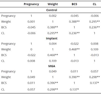 From the results observed in the present study, the pregnancy rate following induction with the fourth-use implant was positively influenced by the weight and BCS of the heifers. According to Wheaton and Lamb (2007)), intravaginal progesterone implants in animals with adequate BCS stimulates estrus, increasing conception rates.