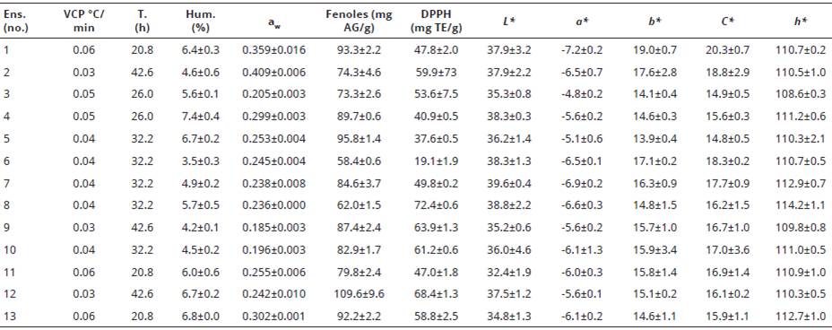 En la Tabla 6 se incluyen los resultados de la comparación entre los métodos de deshidratación por liofilización y por convección, y en la Tabla 7 los valores promedio y las desviaciones estándar de los atributos de calidad (variables respuesta) de las hojas deshidratadas de A. drancunculus por LIO en las condiciones óptimas y por secado mediante convección (SC). Se presentaron diferencias (P < 0.05) entre ambos procesos para las variables humedad, aw, DPPH, L*, a*, C*, h* y la cromaticidad b*, lo que no se observó para el contenido de fenoles totales.