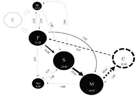The behavioral patterns shown by females of M. nigripes are shown in Table 1, as well as patterns and transitions sequences are presented in Figure 1. Females emerge from the soil at 11:00 hours and travel in short flights to seep willow shrubs. This movement lasts, on average, 240 secs. Each female settle on the leaf and moves forward and backward for 7 secs, stopping in the superior or posterior leaf margin, positioning itself opposite to the soil and hanging with their legs. Right away, they start moving their abdomen in circles (rotates around its own axis), lifting it in a 45° angle and periodically moving up and down their metatarsus, constantly rubbing them during short periods of time. It has been suggested that this behavior corresponds to the ‘calling’ in this species (Romero-López et al., 2010). In this position or settling on the leaf margin, the females put their mandibles on the leaf margin and starts moving them from right to left for 82 secs obtaining small leaf fragments to ingest. These mandibles movements could be the feeding behavior of M. nigripes. Males emerge from the soil 30 seconds after the females repeating the females’ behavior, except for the abdomen movement.