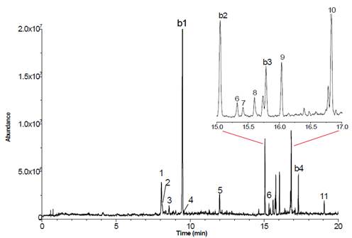 We obtained fifteen chromatogram peaks from which ten were related to chemical compounds structures. Each chromatogram peak with its retention time (RT), molecular ion exact mass, error valúes (Am/z) and proposed structure are shown in Table 2. Peak 10 with a retention time of 16.82 minutes was the most intensive peak. We found peaks b1, b2, b3 and b4 also in the blank (Table 2, Figure 2).