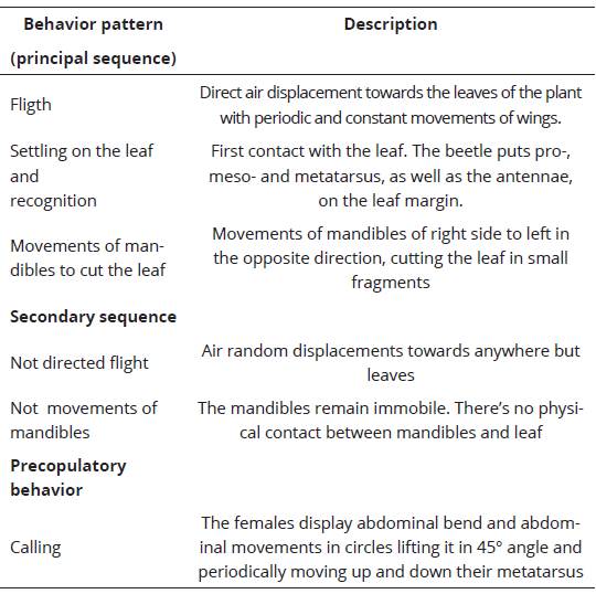 This is the first study that describes at the same time the feeding behavior and the plant- insect interaction of any Melolonthidae species. Previous studies have only reported these aspects separately. For sexual activity, Romero-López et al. (2007)) provided a brief description of the pre-mating behavior of four Phyllophaga species on the leaves of Quercus sp. Also, has been described the pre-mating behavior of Phyllophaga obsoleta Blanchard and some interactions between the adults of this species and leaves of Bouganvillea sp. (Romero-López and Arzuffi, 2010). However, both studies do not provide details of the plant-insect interaction. Another studies, tested the preference of M. nigripes adults for different chemical stimuli, including B. salicifolia leaves using a portable olfactometer (Nieves-Silva and Romero-López, 2016). For plant-insect interactions, Ruther et al. (2002)) demonstrated that the volatiles of the host plant of Melolontha hippocastani F. combined with a sex pheromone function as attractants of adults of this species. Baccharis conferta (Kunth) has been reported as a host plant of M. nigripes (Arce- Pérez and Morón, 2000). It is well known that plant species from the same family and genus share about 45-50% of their chemicals (Bottia et al., 2007; Vazquez et al., 2007).For other hand, in this study has been recorded the presence of cumene in B. salicifolia leaves. This chemical compound has also been reported for Baccharis dentata (Vell.) (Xavier et al., 2012). The chemicals calamene, a-pinene and P-pinene have been previously described for B. salicifolia using the hydrodistillation method (Loayza et al., 1995; Malizia et al., 2005; Carrizo et al., 2009; Budel et al., 2018). The use of different techniques to obtain volatile compounds influence in their detection, however, also influence the biotic and abiotic factors and even the sex of the plant (Drijfhout, 2010; Zuccolotto et al., 2019). The hydrodistillation technique has been used for the extraction of compounds of the genus Baccharis for medicinal purposes, but this technique can only extract volatiles carried by water vapor (Salomé-Abarca et al., 2015).