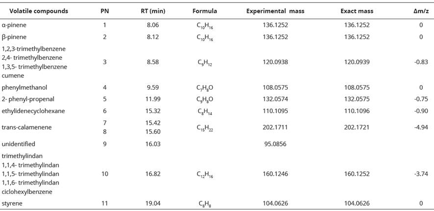 A spectral comparison of the chromatogram peaks was used to identify the volatile constituents of the leaves. In the mass detector we used chemical ionization with methane to produce ions that were assigned to different chromatogram peaks. Based on the proposed chemical structures from Pherobase database and specialized articles, we calculated de exact mass of the detected compounds and the mass/ charge difference (Am/z) and chemical structures were proposed.