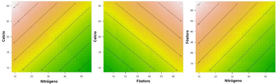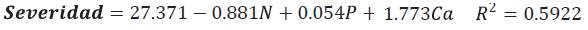 Bajo las condiciones del presente estudio, el análisis de regresión permitió ajustar un modelo lineal múltiple (Ecuación 3), donde el N tiene un efecto negativo sobre la severidad de la enfermedad, es decir, con el aumento de 1 g del elemento, se espera un descenso de 0.881% de ésta. Para P y Ca, se observó el efecto contrario (positivo), o sea, al aumentar el contenido de estos nutrientes en 1 g, ocurren incrementos de 0.054% y 1.773% en la severidad de la enfermedad, respectivamente (Figura 5).