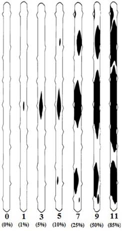 Para esta evaluación se elaboró una escala diagramática de severidad en tallos de mora (Figura 1) utilizando como referencia la escala propuesta por López et al. (2013)), mediante la cual se estimó la severidad de la enfermedad (S) con la ecuación siguiente (Ecuación 1):