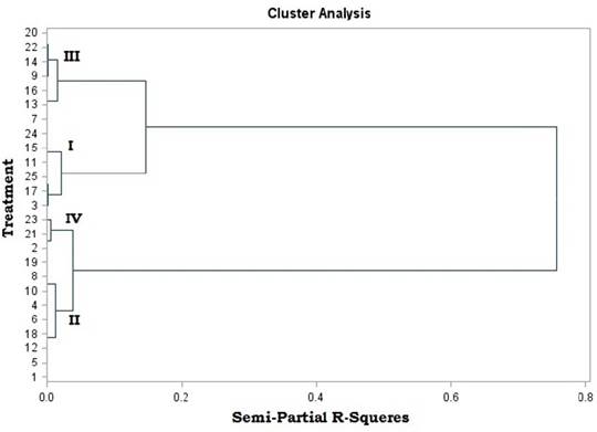 El análisis de conglomerados permitió clasificar los tratamientos en cuatro grupos de acuerdo con los estadísticos propuestos (Figura 2 y Tabla 2). De acuerdo con lo anterior, los grupos presentaron una S comprendida entre 15.9% y 91.8%, un r entre 0.0254 y 0.0468 y un PI entre 9 y 15.3 días (Tabla 2). En el grupo 1 (G1) se ubicaron seis tratamientos que presentaron los valores medios más altos de S y r, así como el valor medio más bajo para PI. La mejor respuesta sobre las variables evaluadas se observó en el grupo 4 (G4), compuesto por tres tratamientos; mientras que en los grupos 2 (G2) y 3 (G3) se agruparon nueve y siete tratamientos, respectivamente; con valores S entre 33.5 y 62.9, PI entre 14.1 y 14.4 y r entre 0.0281 y 0.0368 (Tabla 2 y Figura 2).