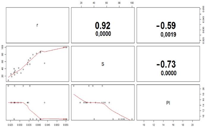 El análisis de correlación de Pearson mostró correlación positiva y significativa entre S y r (P < 0.001), y negativa y significativa, entre PI con S y r (P < 0.001) (Figura 3), lo cual indica que al aumentar la severidad de la enfermedad, se incrementa la tasa de desarrollo; mientras que al aumentar el periodo de incubación disminuyen la severidad y la tasa de desarrollo.
