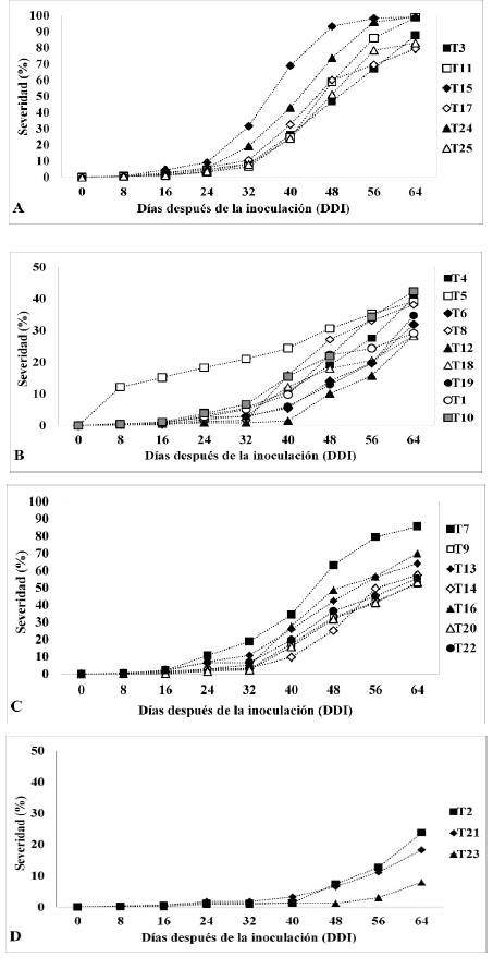 Las curvas de desarrollo de la enfermedad en los grupos identificados (Figura 4), permitieron observar en el G1 un crecimiento exponencial hasta los 40 días después de la inoculación (DDI), seguido de un crecimiento lineal hasta el final del experimento (64 DDI) en todas las plantas de mora que recibieron los tratamientos de fertilización (T), excepto en aquellas plantas de los T15 y T24. Dichos tratamientos presentaron un crecimiento exponencial hasta los 32 DDI, el cual pasó a lineal 48 DDI y se estabilizó al llegar a 100% de severidad 110 DDI (Figura 4).