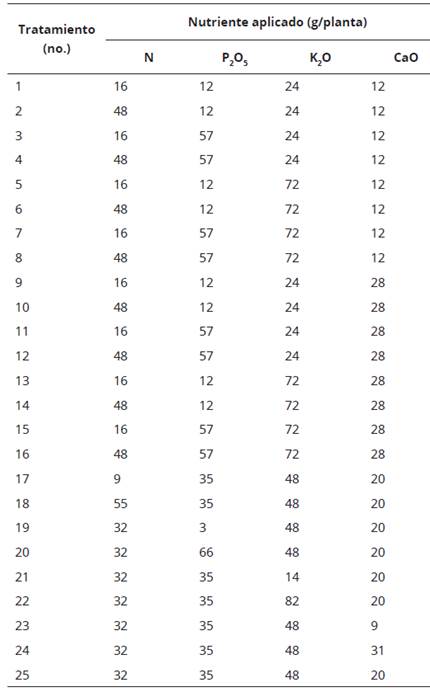 A partir de estudios de fertilización adelantados por Vayas (2000) y Artunduaga (2010), se definieron y aplicaron 25 tratamientos con diferentes dosis de los nutrientes N, P, K y Ca (Tabla 1) en plántulas con espinas de mora de Castilla y uniformidad fenotípica de 10 meses de edad, las cuales fueron propagadas sexualmente y sembradas en bolsas plásticas con 1500 g de sustrato, compuesto por una mezcla de turba y cascarilla de arroz, en relación 3:1. La cantidad total de los elementos por tratamiento se dosificó semanalmente, preparando soluciones nutritivas a partir de ácido nítrico, cloruro de calcio dihidratado, cloruro de potasio, difosfato de amonio, sulfato de magnesio heptahidratado, nitrato de calcio tetrahidratado, nitrato de potasio, sulfato de potasio e hidróxido de sodio, conservando las concentraciones originales de Mg, S y microelementos de la solución nutritiva de Hoagland y Arnon (1950).