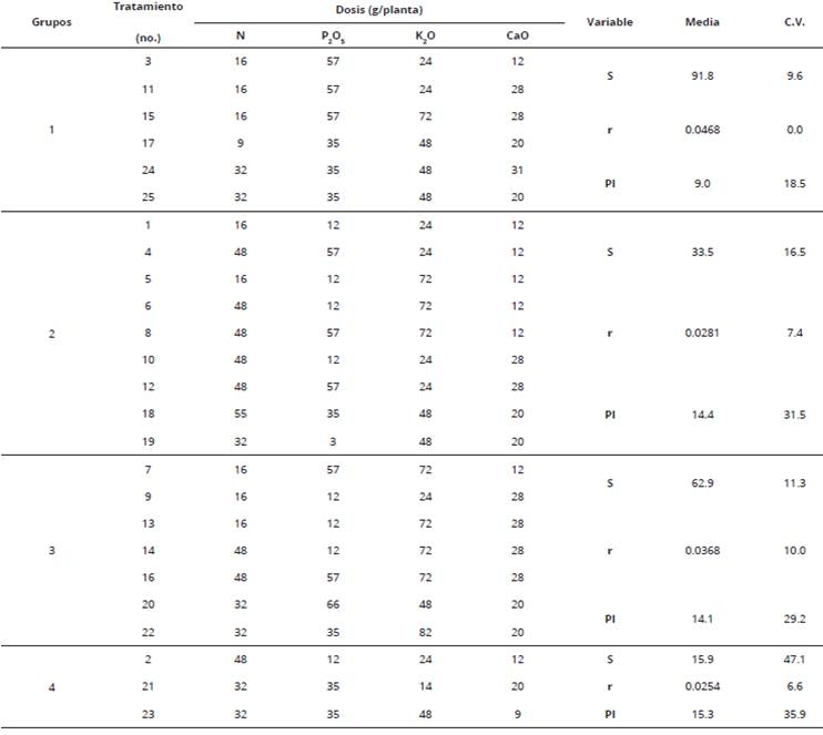De acuerdo con los nutrientes aplicados, los tratamientos del G1 recibieron dosis de todos los elementos, con excepción de N, K y Ca en los T17, T15, T3 y T24, respectivamente. Por otra parte, en el grupo que presentó la mejor respuesta (G4) se observó una mayor variabilidad de las dosis aplicadas, ya que solo hubo coincidencia para N y P en los T21 y T23, presentándose a la vez la menor dosis de Ca en el T23 (Tabla 2).