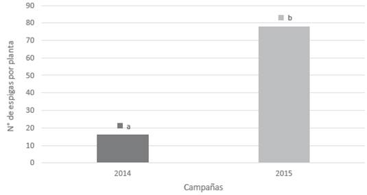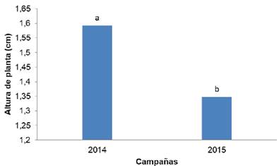 Durante enero y febrero de 2015 la precipitación fue inferior a la de la misma época de 2014 (ver Tabla 2). En la Figura 1 se observa que la altura de planta fue de 1.592 m para la campaña de 2014 y de 1.347 m para 2015 (P < 0.05).
