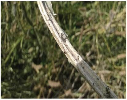 En la campaña 2014 se observaron algunas plantas con tallos afectados por pudrición seca y esclerocios en la corteza (Figura 2), igualmente la presencia de inflorescencias aisladas que presentaron coloración castaño claro en contraste con el resto que presentaba una coloración verde típica de la etapa fenológica de floración. En diferentes sectores de los lotes y en especial en grupos de plantas de mayor altura y abundante follaje se observó desprendimiento de frutos cuajados en el estado de madurez fisiológica.