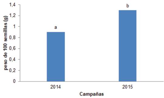El número de espigas/planta:15.9 en la cosecha 2014 y 77.8 en 2015 (Figura 5), y el peso de 1000 semillas: 0.904 g en 2014 y 1.297 g en 2015 (Figura 6) fueron diferentes (P < 0.01) entre ambas campañas. No obstante la mayor altura de planta en la campaña 2014, ésta no estuvo relacionada con la producción de semilla debido a la fuerte incidencia de S. sclerotiorum en la etapa de floración y llenado de grano.