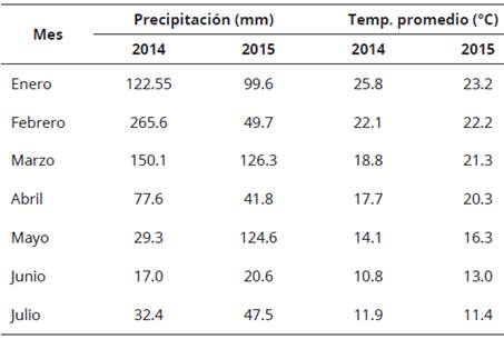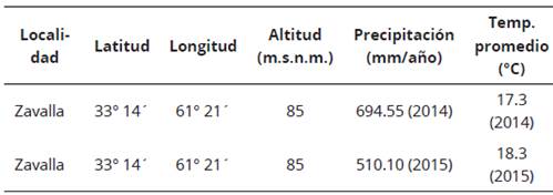 En la Tabla 1 se presentan la localización y las condiciones de clima de la localidad donde se realizó el ensayo y en la Tabla 2 aparecen los registros de clima mensuales durante en período enero - julio de las campañas evaluadas (2014 y 2015). La primera helada agrometeorológica en cada campaña se produjo el 5 de junio de 2014 (2.9 °C) y el 7 de mayo de 2015 (2.5 °C). Se entiende por helada agrometeorológica cuando la temperatura mínima registrada en abrigo meteorológico es menor que 3.1 °C y por helada meteorológica, cuando la temperatura mínima registrada en abrigo meteorológico es menor que 0.1 °C (CIAg, 2013).