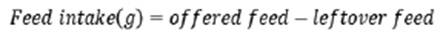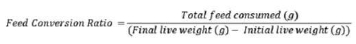 [Eq. 2]The feed conversion ratio was weekly measured (10 chickens per replica) recording 100 data (5T x 4R x 5w), with the equation 3: