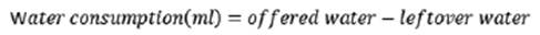 [Eq. 1]The water consumption was weekly measured (10 chickens per replica) registering 100 data (5T x 4R x 5w), with the equation 2: