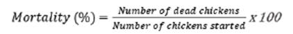 [Eq. 3]The mortality of the birds, as a percentage, was obtaine by dividing the dead birds for which they started the trial, with the equation 4: