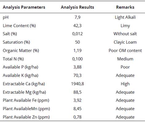 Soil temperature at 20 cm soil depth at the experimental site was daily measured (Figure 1). Climatic data for the duration of experiment were obtained from Meteorological Observation and Record Station of Antalya Directorate of Turkish State Meteorological Service 3 km away from the experimental site (Table 2). Soil from experimental site was analyzed (Anonymous, 1985) in Laben Agricultural Analysis Laboratory (Antalya).